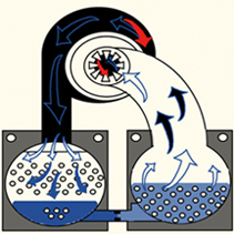 當葉輪高速旋轉時,氣體隨著旋轉,在離心力作用下,氣體被甩到后面的擴壓器中去,而在葉輪處形成真空地帶,這時外界的新鮮氣體進入葉輪。葉輪不斷旋轉,氣體不斷地吸入并甩出,從而保持了氣體的連續流動。效果如下圖: