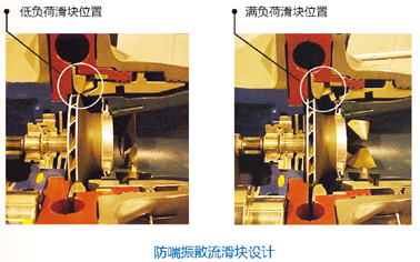 麥克維爾散流滑塊設計,在負荷變化時,可移動的散流滑塊以導葉位置定位,調節散流通道大小,提高離心壓縮機的壓力提升能力,從而使機組在10%-100%(雙壓縮機機組在5%-100%)之間無級調節平穩運行而不會發生“喘振”,不需采用耗能的熱氣旁通調節方式。