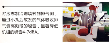 離心式壓縮機內的噪音主要由排氣通道的高速氣體流動造成的。麥克維爾制冷劑噴射系統通過壓縮機排氣腔上的一系列徑向排列噴口,把少量的液態制冷劑噴至排氣側,冷媒在高溫環境下立時汽化,形成霧狀制冷劑,吸收排氣過程中產生的高頻噪聲,減低高速氣態冷媒沖擊外殼所產生的噪聲,降噪效果十分顯著。另外,散發的氣體能降低壓縮機的排氣過熱度,增加冷凝器效率,從而提高制冷系數。