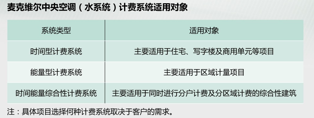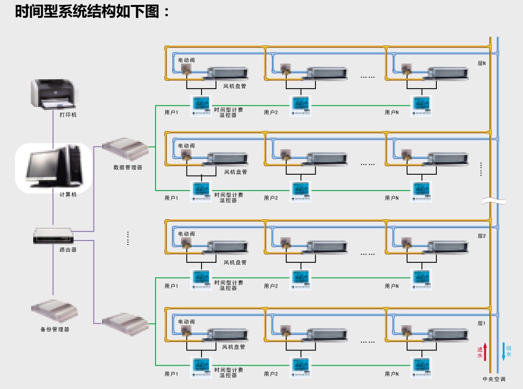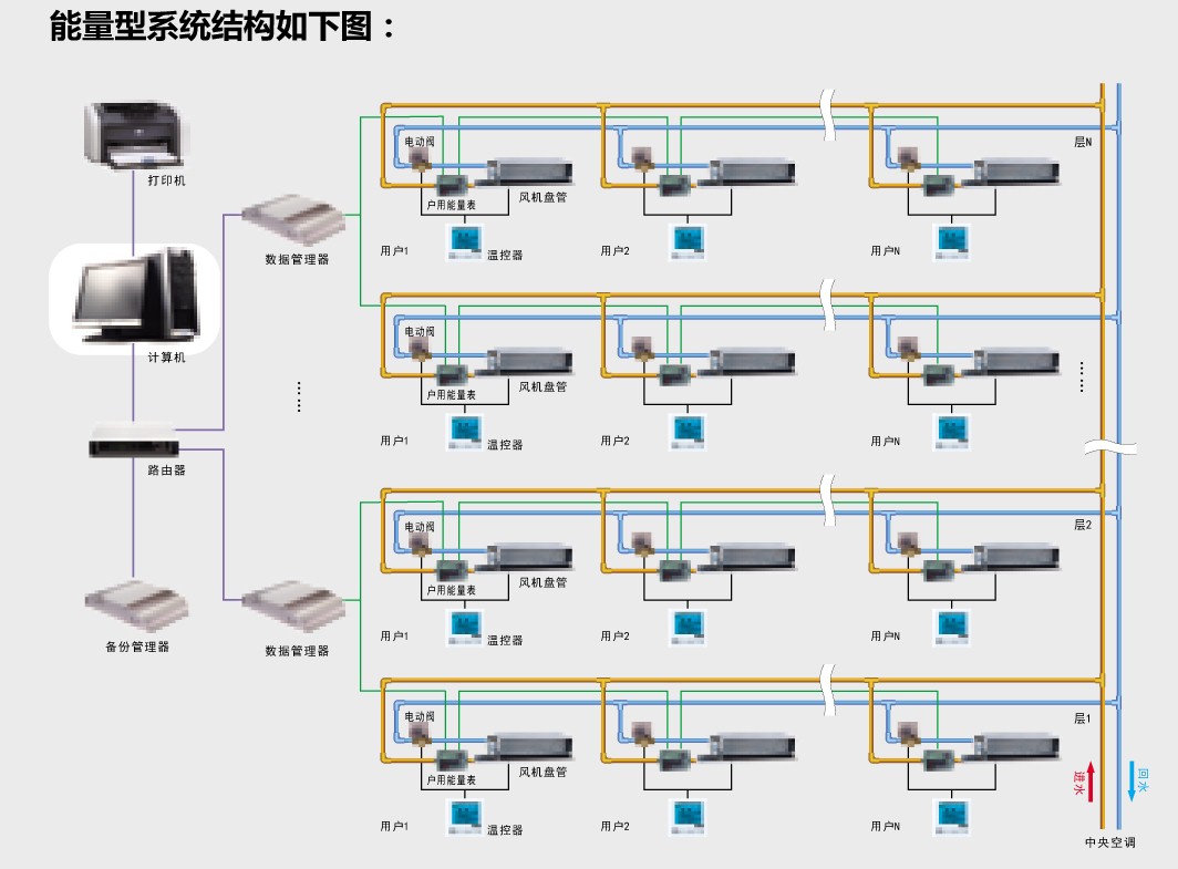 能量型中央空調計費系統,通過使用戶用能量表測量用戶末端進水溫度和回水溫度以及流量,依據熱力學原理,計算出用戶消耗的的冷量或者熱量能量值,以此作為用戶費用的分攤依據。