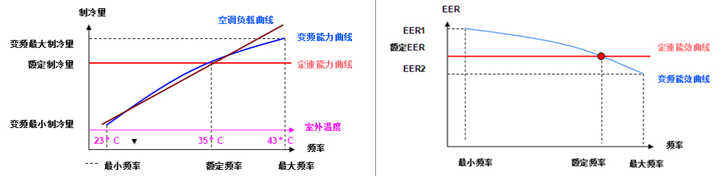 定頻空調的節能評價是按照額定能力、額定工況下的EER(空調器的制冷性能系數)值來確定的,其指標可以定性為實驗室測試的相對評價指標,可以相對的評價出不同空調在額定能力下的節能好壞。但其不能真實反應空調在消費者實際使用運行過程中的節能效果。定頻空調能效指標只是考慮了額定工況下額定負載這一個點的節能特性。下圖為變頻空調與定頻空調制冷量與制冷效率范圍的對比圖。