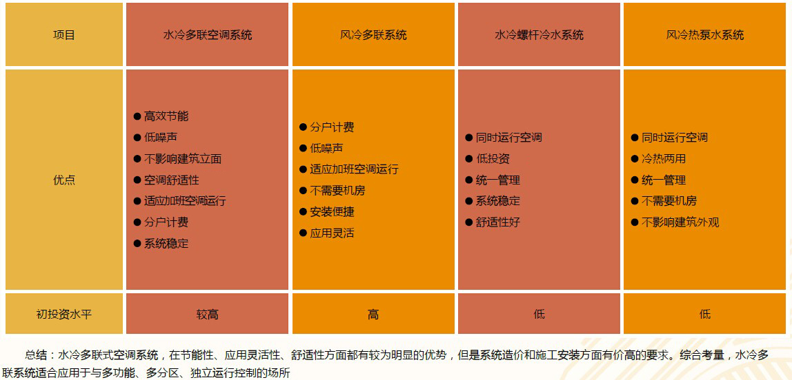 水冷多聯(lián)機(jī)是風(fēng)冷多聯(lián)機(jī)產(chǎn)品發(fā)展的新形式,不但延續(xù)風(fēng)冷多聯(lián)機(jī)技術(shù)和應(yīng)用優(yōu)勢,同時也繼承了冷水機(jī)組穩(wěn)定可靠等多方面的優(yōu)勢,是一款順應(yīng)時代發(fā)展的節(jié)能環(huán)保、應(yīng)用靈活的技術(shù)型產(chǎn)品。水冷多聯(lián)雖結(jié)合了風(fēng)冷多聯(lián)和水冷系統(tǒng)的諸多技術(shù),但在系統(tǒng)形式、系統(tǒng)特點(diǎn)和設(shè)計施工上有很多的區(qū)別,同時對比其他空調(diào)系統(tǒng)形式如:離心式/螺桿式冷水機(jī)組、風(fēng)冷熱泵機(jī)組等,也有自身的優(yōu)勢。