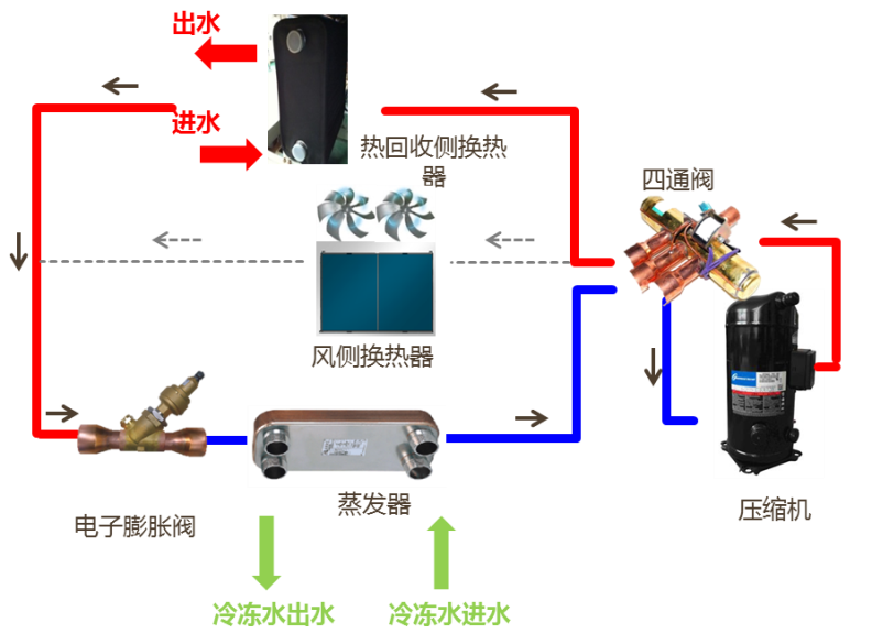 當(dāng)夏季運(yùn)行制冷時(shí),通過(guò)熱回收側(cè)換熱器水泵的開、關(guān),實(shí)現(xiàn)制冷、制冷+熱回收。