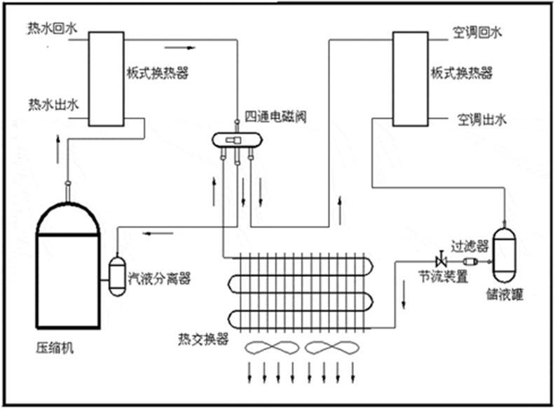 當(dāng)冬季運(yùn)行制熱時(shí),通過(guò)熱回收側(cè)換熱器水泵的開、關(guān),實(shí)現(xiàn)制熱、制熱+熱水。